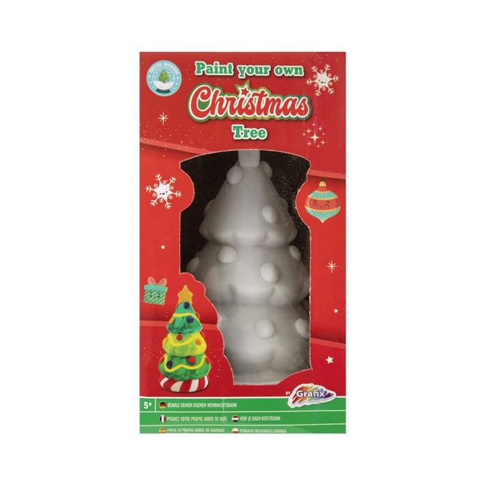 Комплектът включва керамична елха, 4 цветни бои и четка за рисуване.