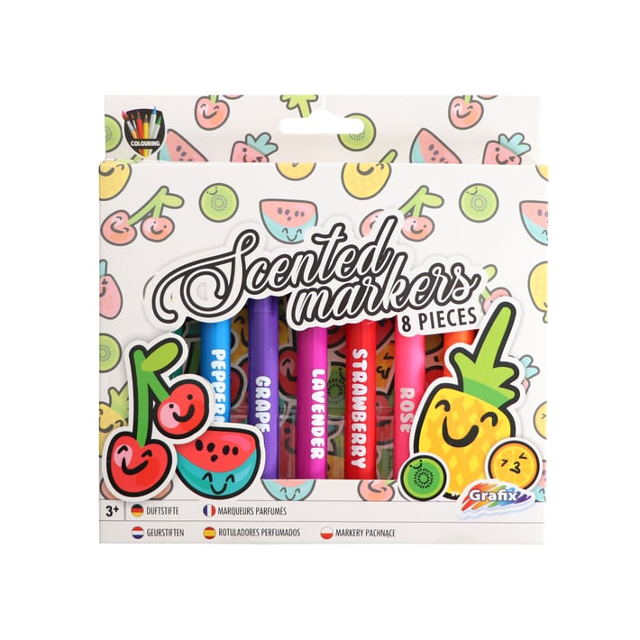 Всеки флумастер е с различен аромат: портокал, лимон, лавандула, грозде, роза, ягода, мента и ябълка.