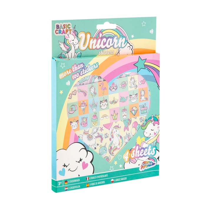 4 листа с повече от 100 различни цветни стикера с еднорози!