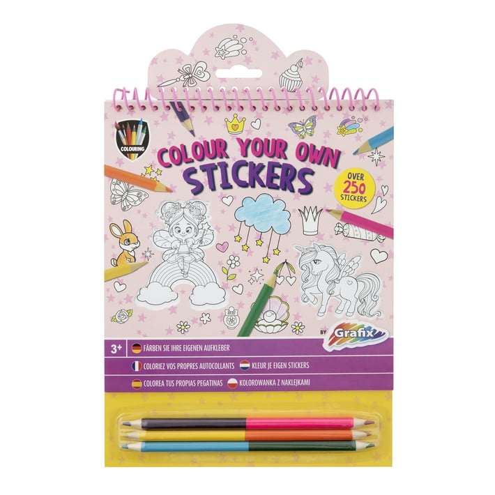 С трите двустранни молива, включени в комплекта, детето може да оцвети стикерите по собствен вкус.