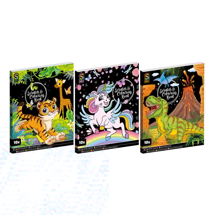 Опаковката съдържа 6 комплекта за издраскване "Еднорог", 6 комплекта "Тигър" и 6 комплекта "Динозавър".
