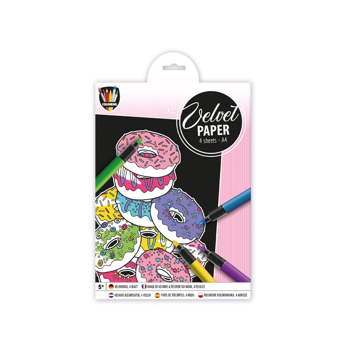 • Комплектът съдържа 4 листа велурена хартия с изображения на понички.