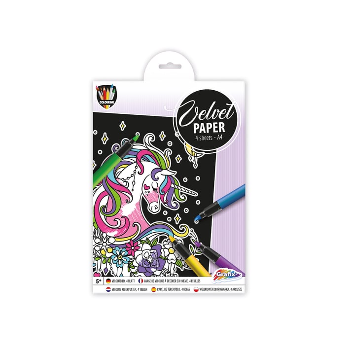 • Комплектът съдържа 4 листа велурена хартия с изображения на еднорози.