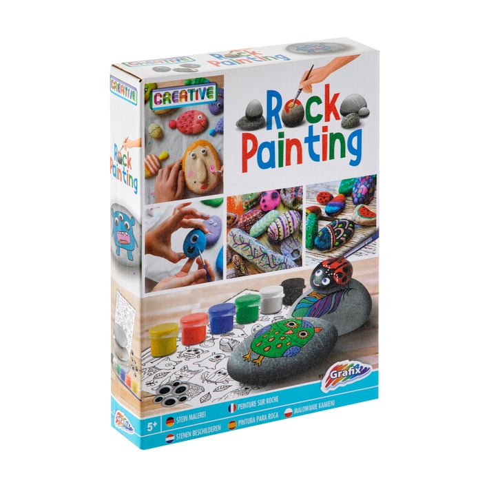 • Комплектът включва 3 камъка за рисуване, 6 цветни бои и четка, 6 лепящи мърдащи се очички и стикери за оцветяване.