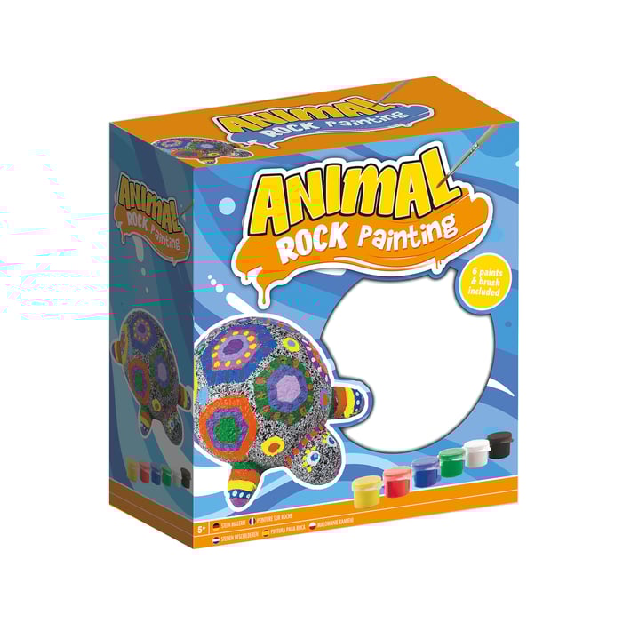 Комплектът включва камък за рисуване във формата на костенурка, 6 цветни бои и четка.