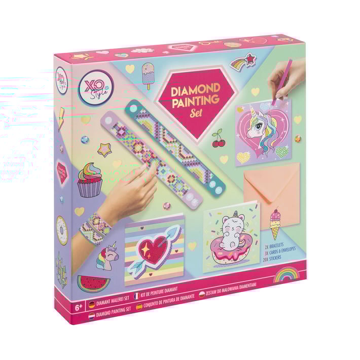 Комплектът съдържа: 2 гривни, 3 картички за шаблони за рисуване с мъниста, 20 стикера.