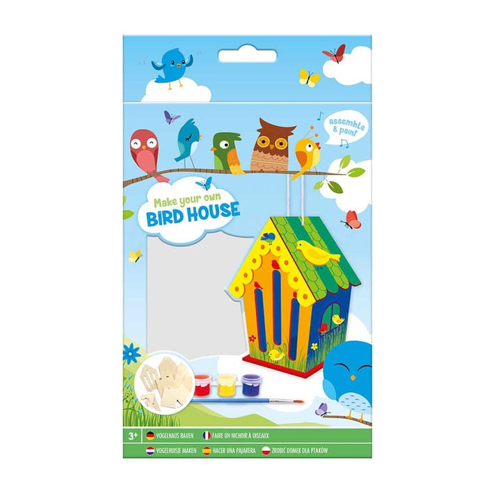 Арт комплект, съдържащ всичко необходимо за направата на къщичка за птици.