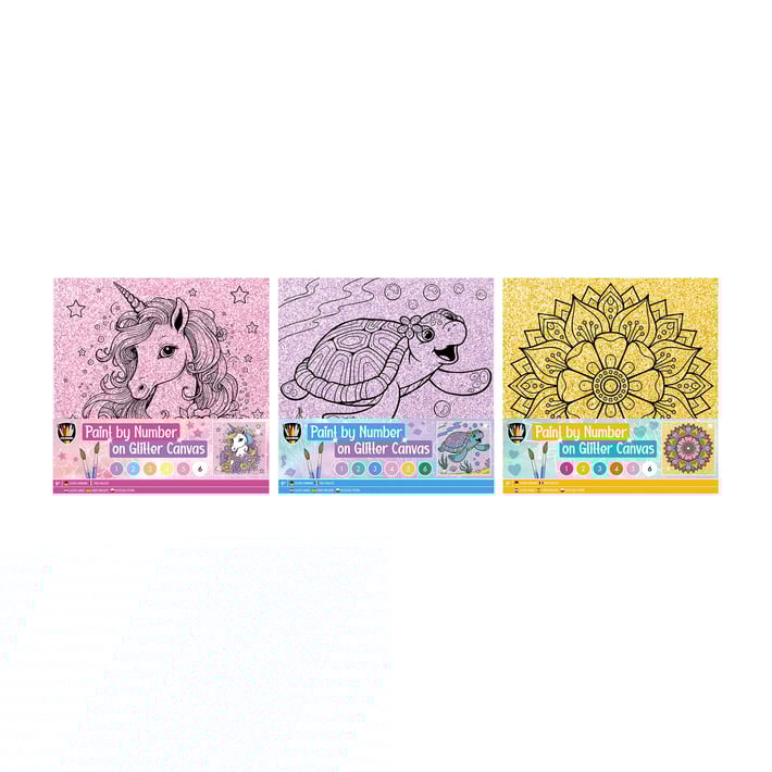 Опаковката включва 16 комплекта платна за оцветяване по номера „Костенурка", 16 комплекта „Еднорог" и комплекта „Цвете".