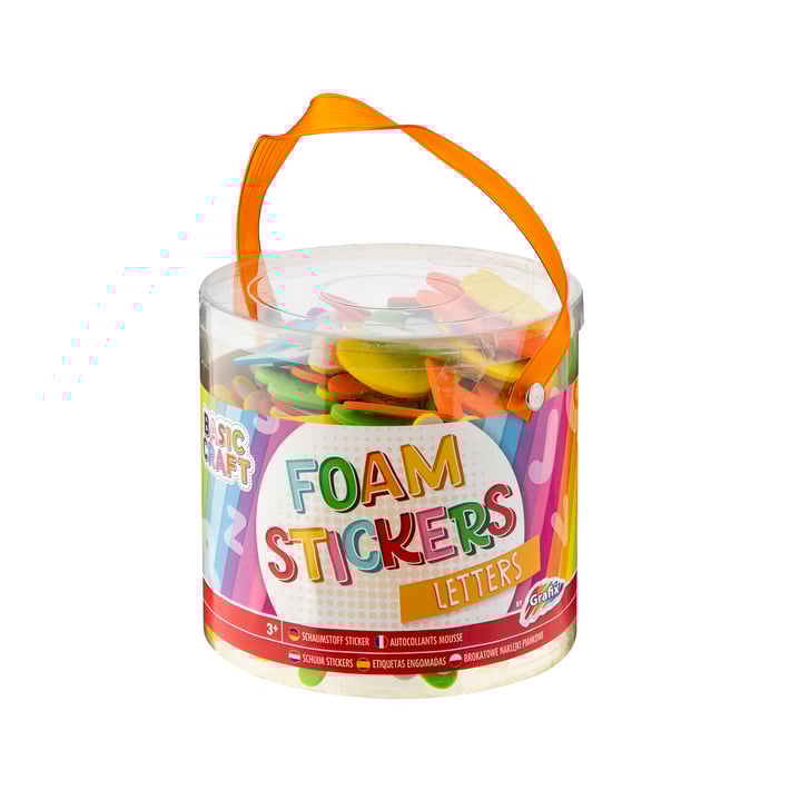 • Разноцветни латински букви за игра, поместени в пластмасова кофа с дръжка.