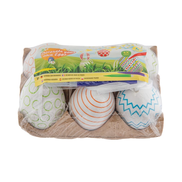• Комплектът включва 6 яйца за декориране и 4 флумастера.
