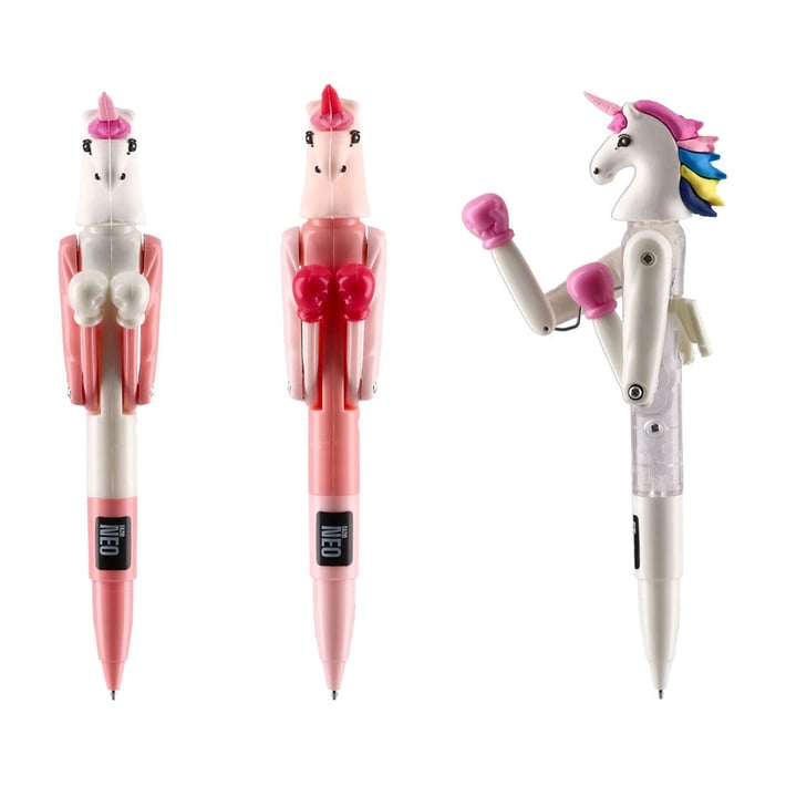 Декоративна химикалка с оригинален дизайн във формата на еднорог. Моделът разполага с подвижни ръце, които могат да се движат и създават забавен „боксиращ“ ефект, превръщайки химикалката в интересен аксесоар за писане. Подходяща е за училище, офис или като закачлив подарък.