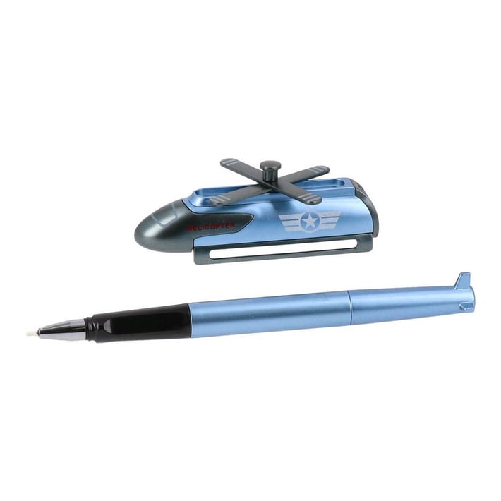 Химикалка с декоративен елемент с мотив хеликоптер. Моделът е изработен от пластмаса и е снабден със син пълнител, който осигурява гладко и удобно писане. Подходяща е за ежедневна употреба в училище, офиса или у дома, като съчетава практичност и закачлив дизайн.