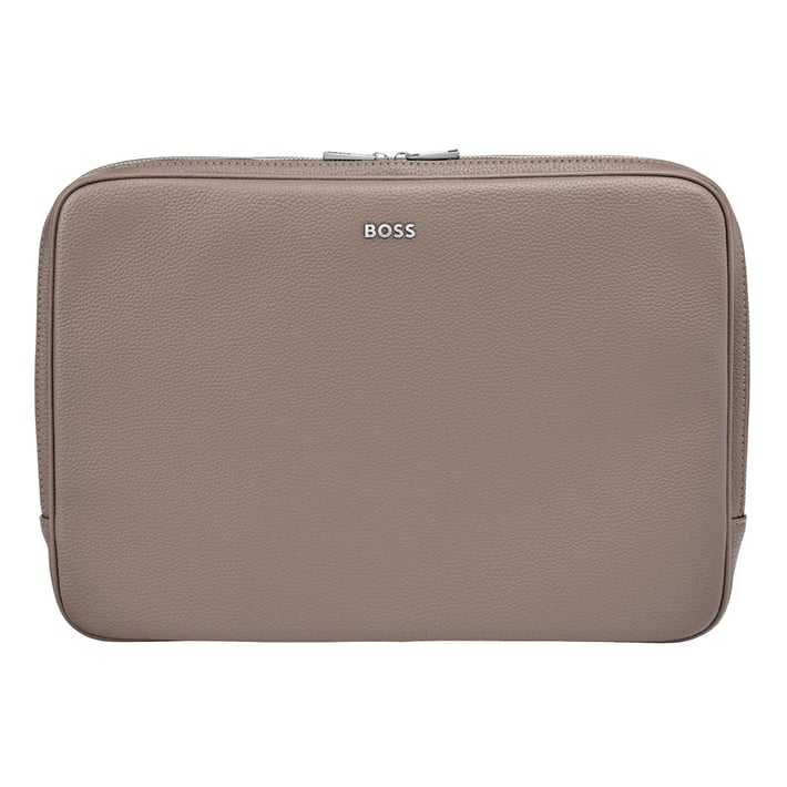 Компютърният калъф Grained Classic впечатлява с мека текстура, наподобяваща естествена кожа, допълнена от изчистена хромирана плочка с логото BOSS и стилни хромирани ципове. Вътрешната подплата в тон с основния цвят е декорирана с фин монограм, който подчертава прецизната изработка. Благодарение на множеството отделения и оптимална организация, калъфът предлага място за документи, кабели, химикалки, телефон, карти и всички ежедневни аксесоари.