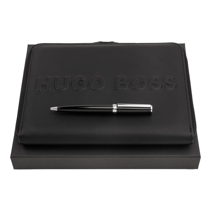 Папката се отличава със своя кожен дизайн с 3D лого Hugo Boss и е с включен пад за писане от 40 листа.