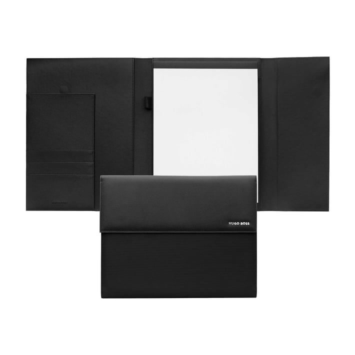 Папката се отличава със своя кожен дизайн с ярка пластина с подпис HUGO BOSS в цвят хром.