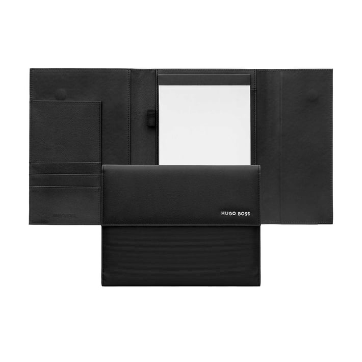 Папката се отличава със своя кожен дизайн с ярка пластина с подпис HUGO BOSS в цвят хром.