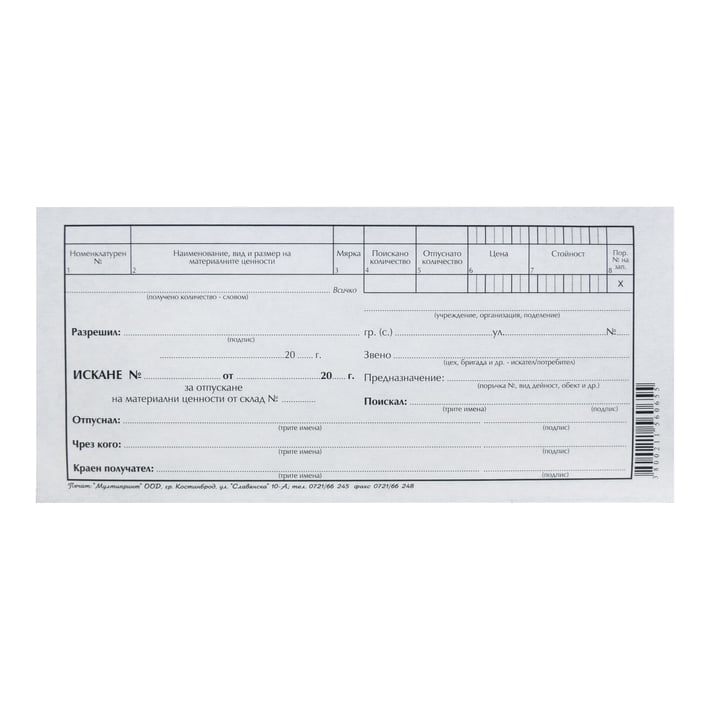 Искане за отпускане на материални ценности, 1 ред, химизирано, 100 листа