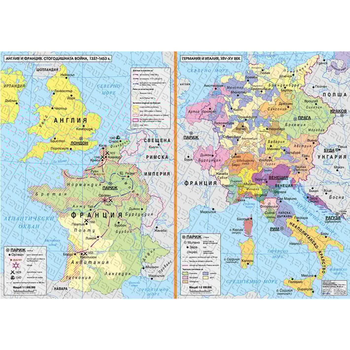 Карта Aнглия и Франция, стогодишната война 1337–1453 г., Германия и Италия XIV–XV век