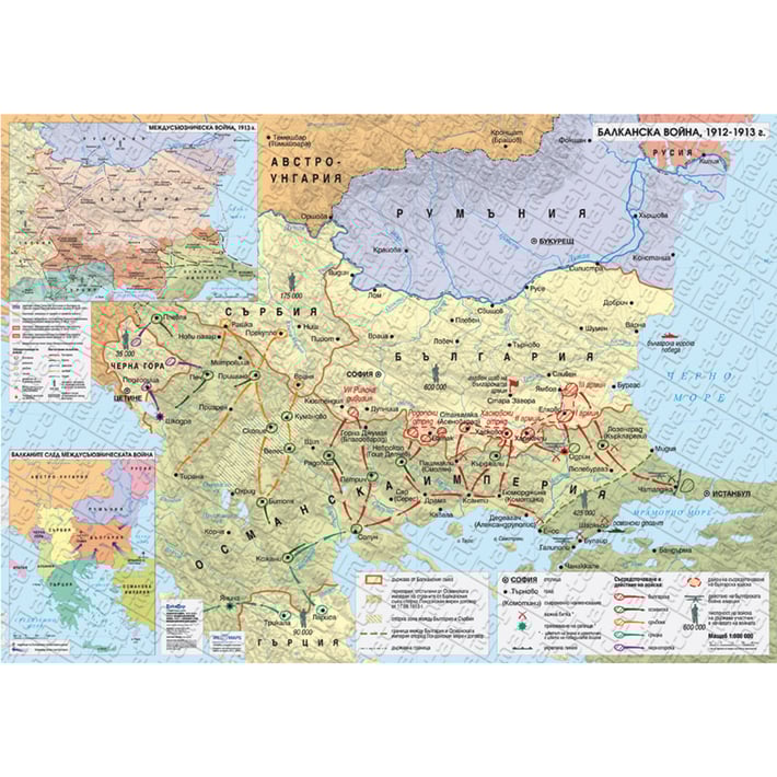 Издание 2010 г. Размери: 140 x 100 cm. Двустранно ламинирана. Тегло: 0.583 kg. Съдържа: географска мрежа; хидрография; територия на Османската империя, държавите от Балканския съюз, спорни зони, и др. територии, представени чрез фоново оцветяване или щриховка върху сенкорелеф; райони на съсредоточаване на войски, държавни граници; граница между България и Османската империя според Лондонския мирен договор; действия на българската, гръцката, сръбската и черногорската войска; битки; укрепена линия; действия на българската бойна авиация; численост на войските, столици и градове; турски крепости; надписи на хидрография, държави и други.