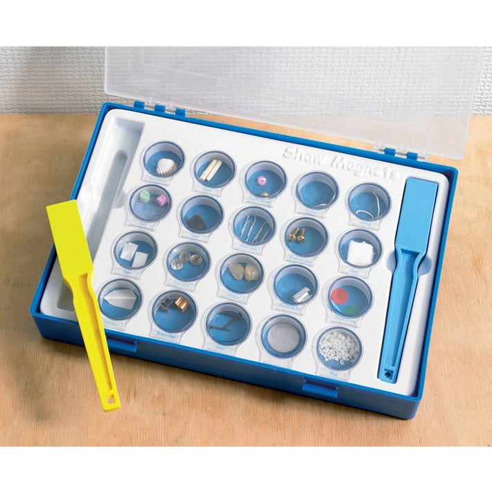 20 магнитни и немагнитни разнообразни предмета, добре запечатани в прозрачни пластмасови пота с 2 магнитни пръчки, които да тестват магнетизма.Комплектът е подходящ за индивидуална и групова работа, предоставен в здрав калъф за съхранение.Включени материали: миди, дърво, пластмасови мъниста, шайби, конец, креда, пяна, хартиени клипсове, месингови винтове, плат, хартия, цветни карфици, камъчета, алуминиево фолио, полистирол, пера, медни скоби, гвоздеи, неръждаема стомана и ориз.Размери: 220 x 330 x 50 mm.