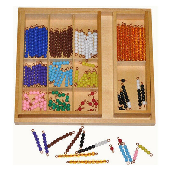 Хубаво е преди това детето да се е запознало с „Комплект златни мъниста - 1, 10, 100, 1000 мъниста” и с „Комплект дървени плочки с числа”.