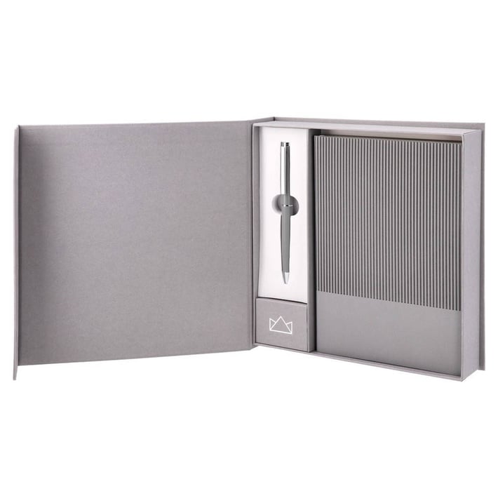 • Подаръчен комплект с тефтер A5 и метална химикалка, представен в луксозна кутия.