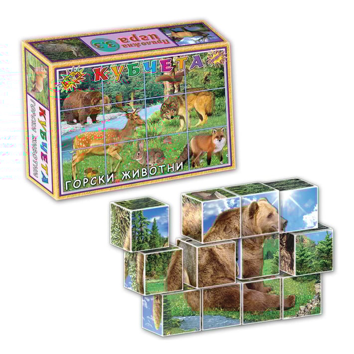 • Комплектът кубчета с горски животни съдържа 12 броя кубчета с размери 4 x 4 cm.