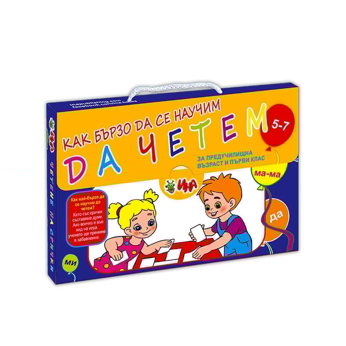 Как най-бързо да се научим да четем? Като със срички съставяме думи. Ако всичко е във вид на игра, ученето ще премине в забавление.Куфарчето съдържа 30 карти с едри букви, с които могат да се играят няколко игри.Картите са от типа „Напиши и изтрий“. Така детето ще може да се упражнява много пъти.В куфарчето има и книжка за оцветяване с рисунки и думи на срички. Те мога да бъдат изписани с магнитните срички, които също ще намерите в комплекта.