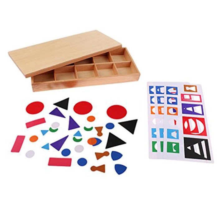 Дървена кутия с картонени шаблони на граматическите символи на Монтесори.