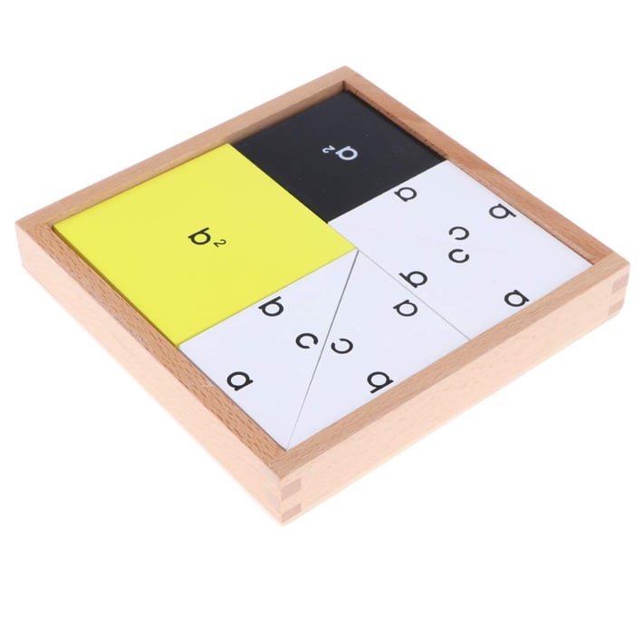 Mатериал Монтесори, който е изработен от дърво. Продуктът се състои от дървена кутийка, в която се съдържат 6 геометрични фигури - 2 бели триъгълника, 1 жълт квадрат, 1 червен квадрат, 1 черен квадрат и 1 бял правоъгълник. На всеки триъгълник са написани буквите a, b и c, които съответно са разположени в близост до някоя от страните (някои от ръбовете) на триъгълника. В средата на всеки един от квадратите е написано: a2, b2 или а2 + b2.