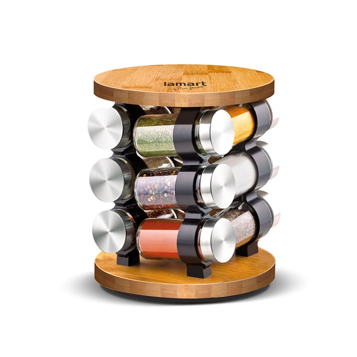 Комплект бурканчета за подправки на въртяща се бамбукова стойка в модерен дизайн.