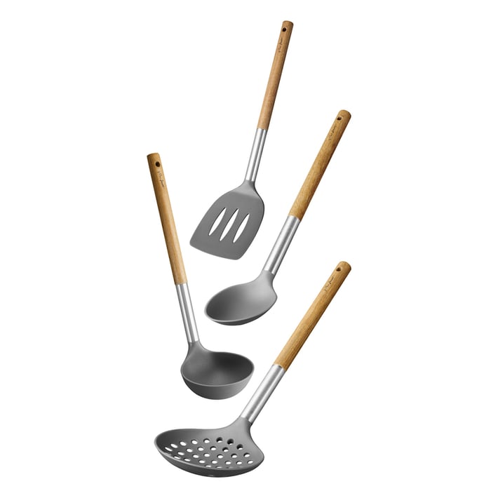 Комплект от 4 кухненски инструмента, включващ черпак, решетъчна лъжица, шпатула и лъжица за разбъркване.