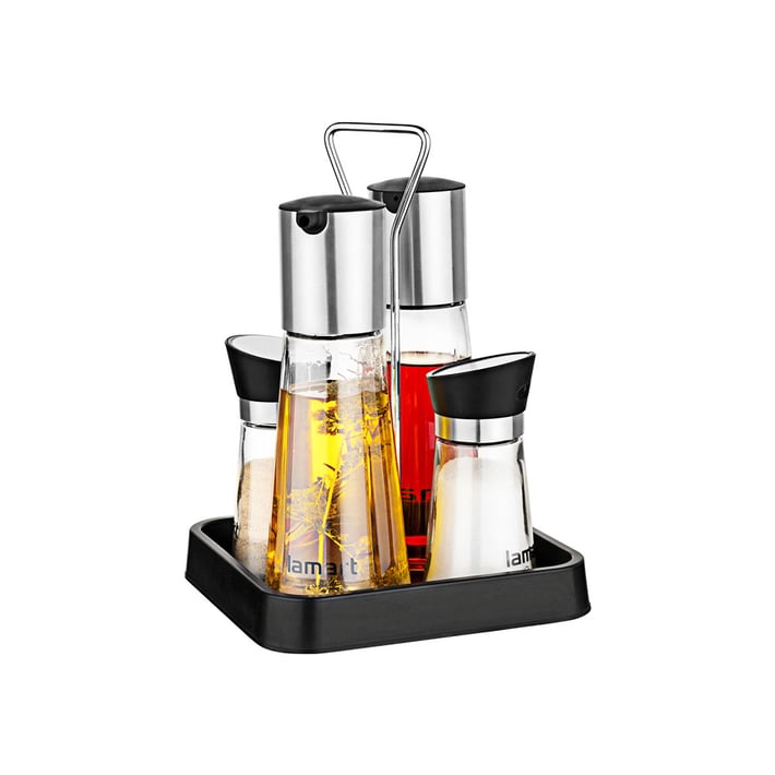 Практичен настолен оливерник за сол и черен пипер и комплект бутилки за олио и оцет, предназначени за дома и заведенията за обществено хранене.