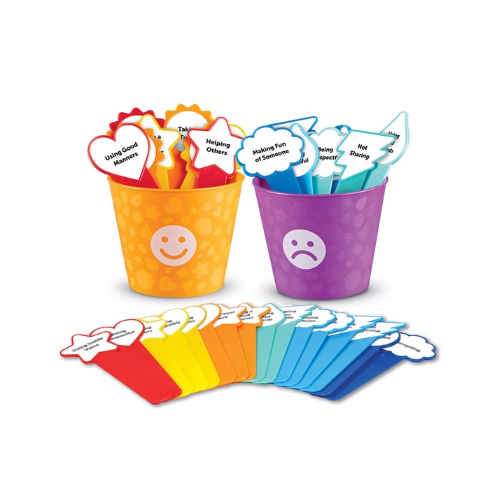 Табелките за добро поведение се поставят в оранжевата кофичка, а тези за лошо - в лилавата.