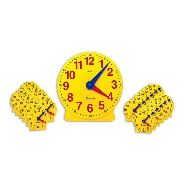 Съдържание: 1 голям демонстрационен часовник и 24 малки часовници. Размер на големия часовник: 34 cm; размер на малките часовници: 10 cm. Всички часовници имат стойка. Включва упътване за учителите на английски език.