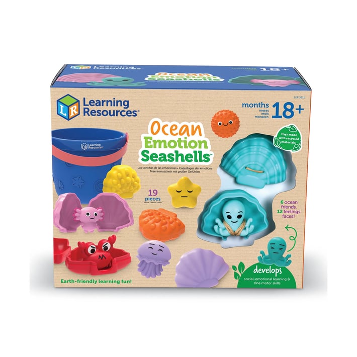 Вътре в цветните мидички се крият 6 очарователни морски приятели – медуза, риба балон, октопод, морска звезда, рак и аксолотъл. Всяко създание има две различни изражения, което позволява на децата да сравняват и разпознават различни емоции по лесен и достъпен начин.