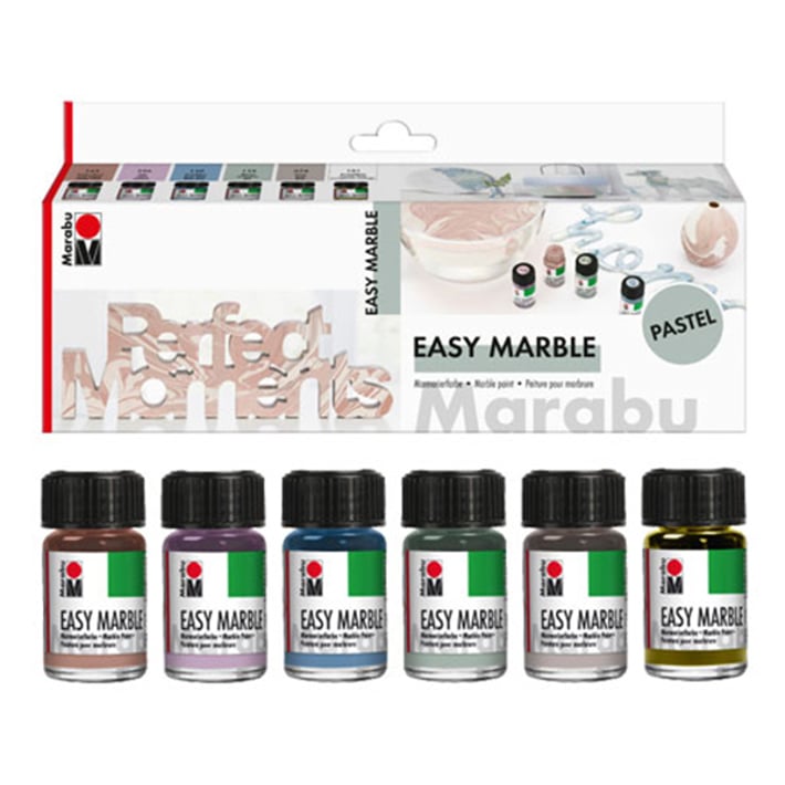6 цвята Marabu Easy marble по 15 ml: 165 таупе розе, 296 лила, 140 сиво-син, 078 сив, 159 имел, 101 прозрачен.