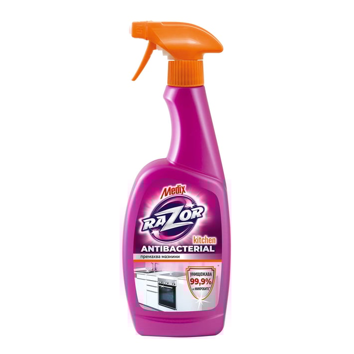 Medix Razor Multisurface универсалният дезинфекциращ спрей за кухня е идеално средство за защита на Вас и Вашето семейство от 99,9% от микробите* Escherichia coli, Pseudomonas aeruginosa, Staphylococcus aureus, Enterococcus hirae, Candida albicans.