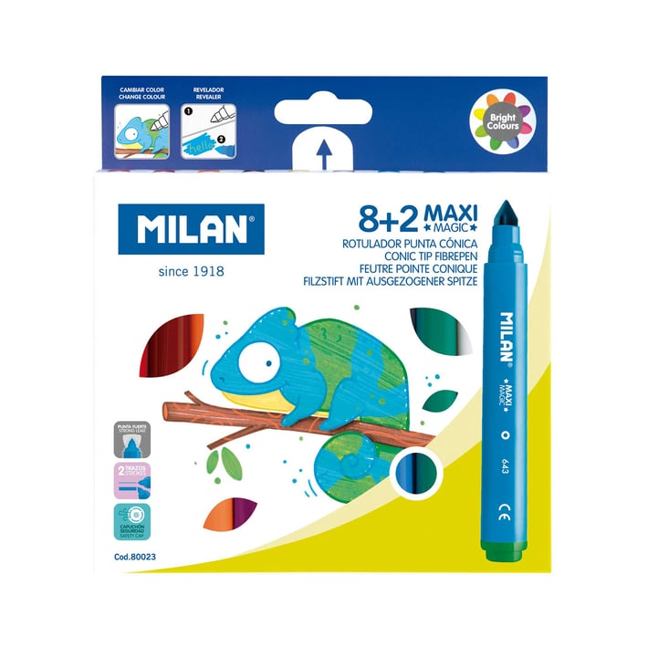 Опаковката съдържа 8 стандартни и 2 "магически" MAXI флумастера. Оцветете рисунката си, изчакайте около 5 секунди и след това използвайте магическия флумастeри, за да видите как нанесените цветове се трансформират. Сега можете да пишете и тайни бележки с включените допълните флумастери и да разкриете тяхното послание, посредством нанасяне на мастило от стандартен MAXI флумастер.