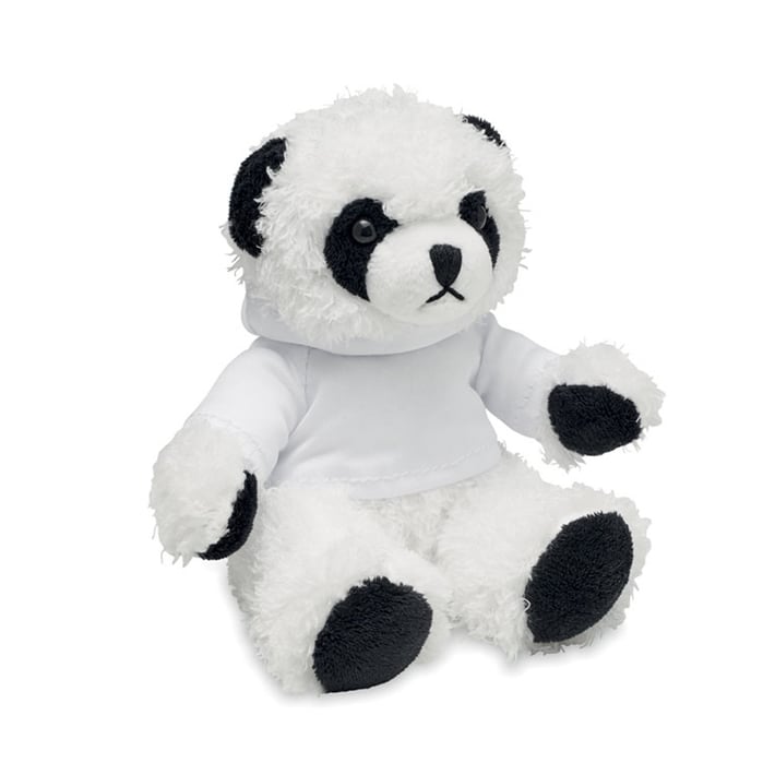 • Плюшено мече панда, облечено в пуловер с качулка.