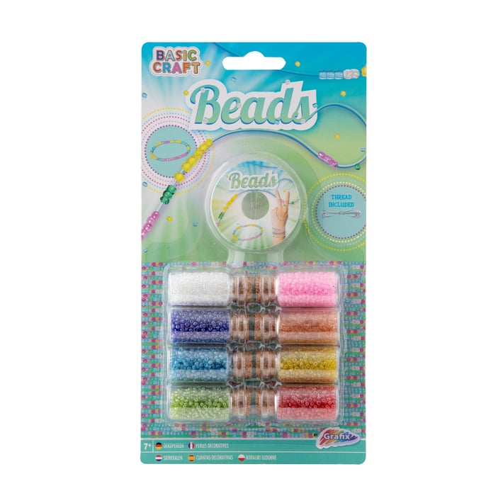 • Комплектът включва 8 различни цвята мъниста в малки шишенца и корда за нанизване.