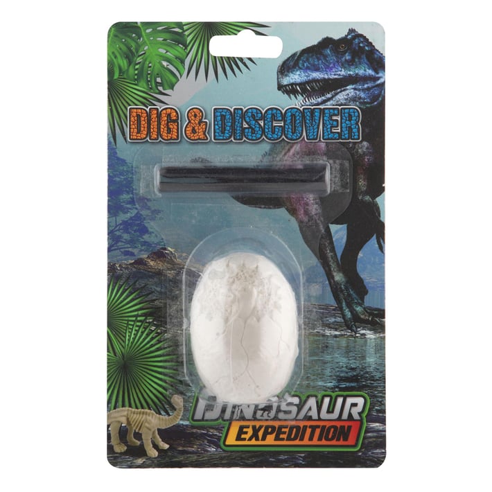 Включва блок с фосил (яйце или квадратен блок), инструмент за изкопаване и четка за разкриване на скрития фосил.