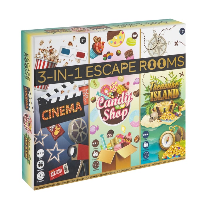 Потопете се в света на загадките с настолната игра Moxy Escape Room 3 в 1! Комплектът включва три различни тематични приключения – Cinema, Candy Shop и Treasure Island, които предлагат логически предизвикателства, кодове и мистерии за разгадаване. Играта развива наблюдателност, логическо мислене и работа в екип, като пренася автентичното преживяване от escape room стая у дома. Подходяща е за деца и възрастни и е идеален избор за семейни вечери и забавление с приятели.
