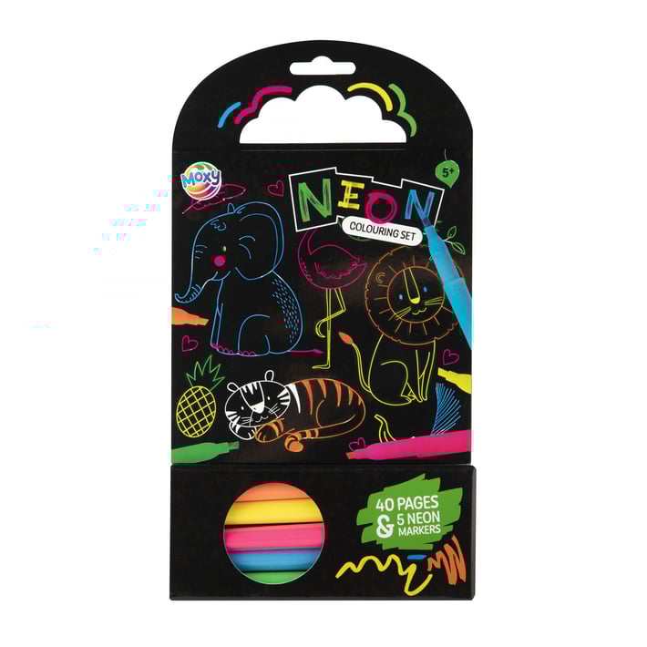 • Неоновата книжка за оцветяване Moxy превръща всяка рисунка в цветно приключение.