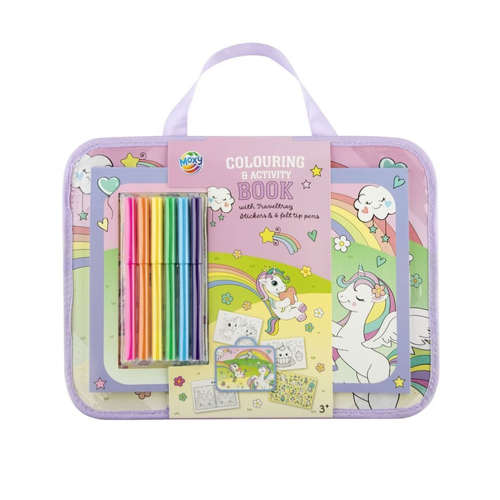 Творчески комплект, създаден специално за забавление в движение! Удобният куфар-папка събира в себе си книжка за оцветяване и игри, цветни стикери и 6 флумастера – всичко необходимо за дълги пътувания, почивки или моменти у дома.