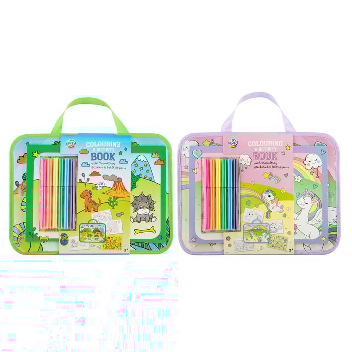Децата могат да оцветяват, да решават лабиринти, задачки и активности, като развиват фината моторика, концентрацията и въображението си. Практичната дръжка прави комплекта лесен за носене навсякъде.Комплектът включва: