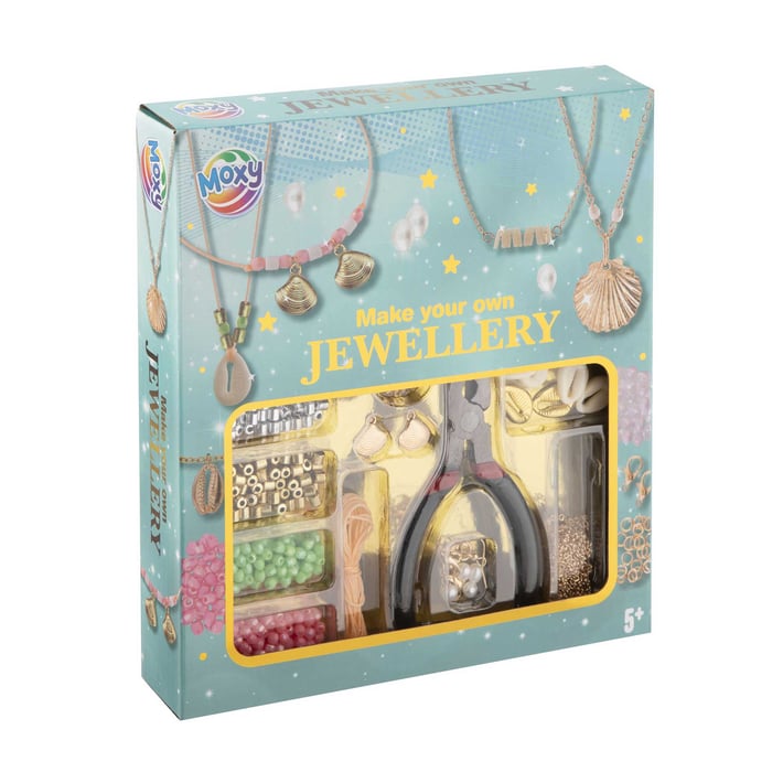 Комплектът включва мъниста и клещи, с които да направите своите уникални гривни, гердани или обеци.
