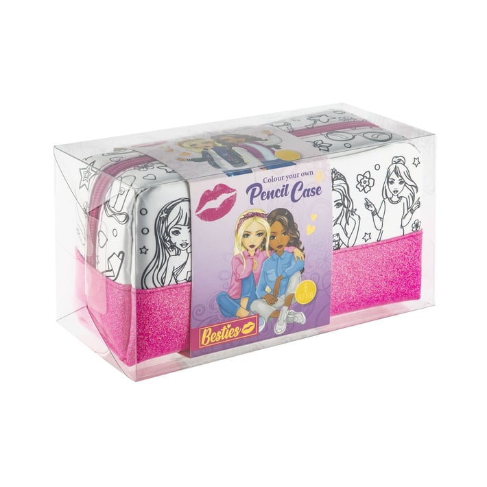 Превърни любимия си несесер в уникален аксесоар със собствен дизайн! Този стилен несесер от серията Besties идва с черно-бели илюстрации, които детето може да оцвети, използвайки включените 6 цветни флумастера. Забавен, креативен и практичен, той е идеален за училище, рисуване или съхранение на моливи и дребни принадлежности.Подходящ за творчество и персонализация на малки артистични личности.