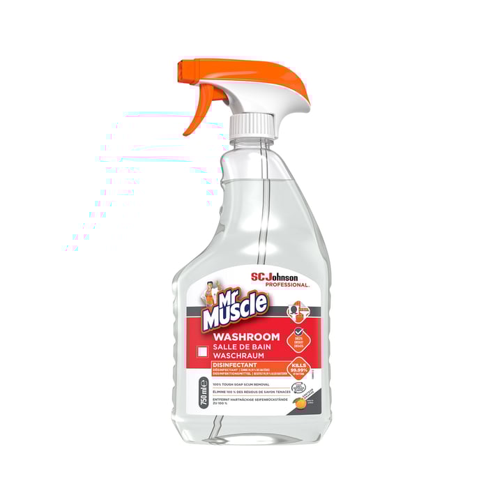 Почистващ спрей Mr.Muscle, който убива 99.99% вируси* и бактерии върху твърди, непорести повърхности.