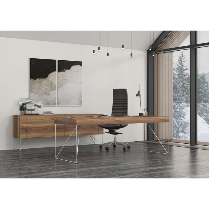 Бюрото Air Executive представлява перфектна комбинация от естетика и функционалност, отразена във всяка негова детайл. Работният плот на AIR Executive е изработен от висококачествен фурнир, който не само придава изискан вид, но и осигурява издръжливост и дълготрайност. Стилните метални крака придават на бюрото елегантност, като и гарантират стабилност и солидно излъчване. Те са проектирани със специална цел - да скрият всички кабели, осигурявайки по-чиста и удобна работна среда. Това не само придава на бюрото Air Executive по-професионален вид, но и предлага практичност и удобство за потребителя.
